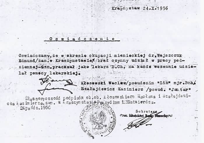 Oświadczenie stwierdzające udział dr Wajszczuka w pracy podziemnej jako lekarz BCh