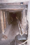 Ozdobny żyrandol wyrzeźbiony w soli przy wejściu do Kaplicy Św. Antoniego |  Wejście do starego chodnika w kopalni - po prawej stronie przy ścianie rynna na solankę |